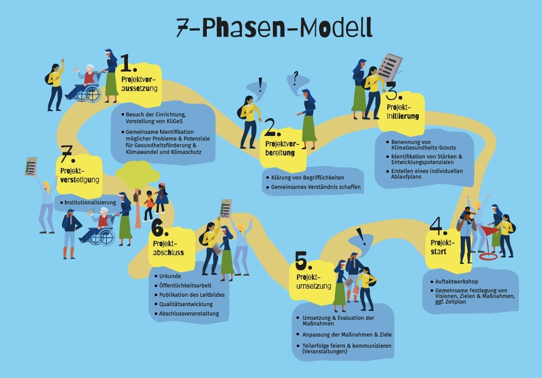 Um eine gelungene Zusammenarbeit mit den Lebenswelten zu garantieren, wird das Praxis- und Forschungsprojekt in Kindertagesstätten und Pflegeeinrichtungen umgesetzt und orientiert sich an einem modifizierten 7-Phasen-Modell in Anlehnung an Geene & Rosenbrock (2012):